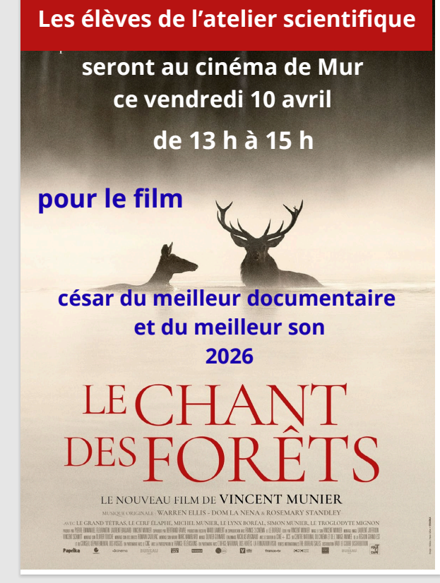 Les élèves de l’atelier scientifique sont allés à la salle Bertrand Tavernier pour le visionnage du film "Le Chant des forêts" ce vendredi 10 avril après-midi.